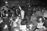 광주 거리행진을 원천봉쇄한 경찰 앞에서 연좌농성을 하는 통일선봉대원들