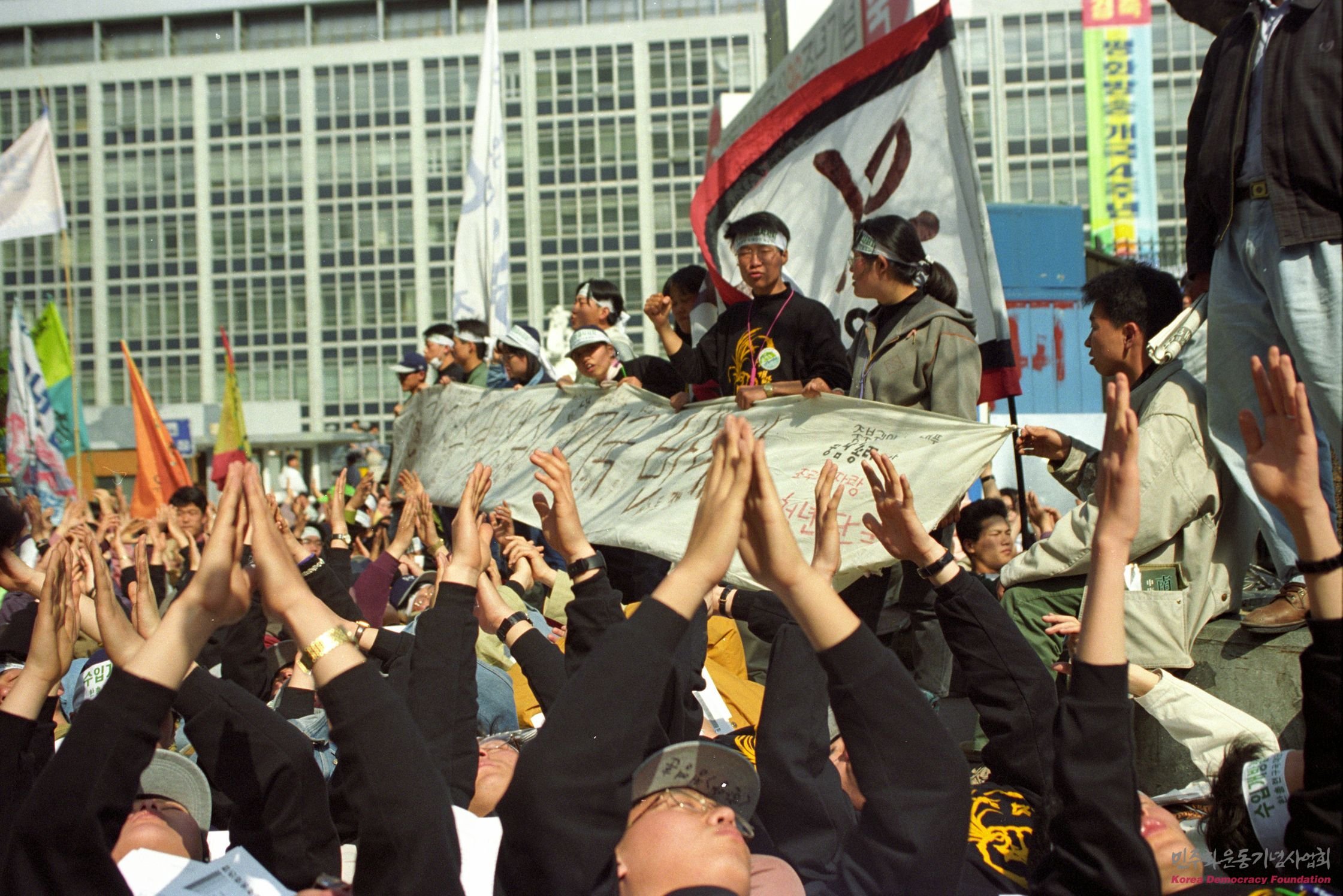 쌀수입 개방에 반대하며 연좌시위에 들어간 학생들