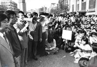 5.18 특별법 제정, 노태우 구속, 김영삼 대선자금 공개 촉구 제7차 국민대회에서 결의문을 들고 구호를 외치는 재야 민주화 인사들