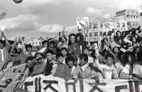 평화쟁취 및 민주인사 석방을 요구하는 플래카드를 들고 행진하는 대회 참가자들