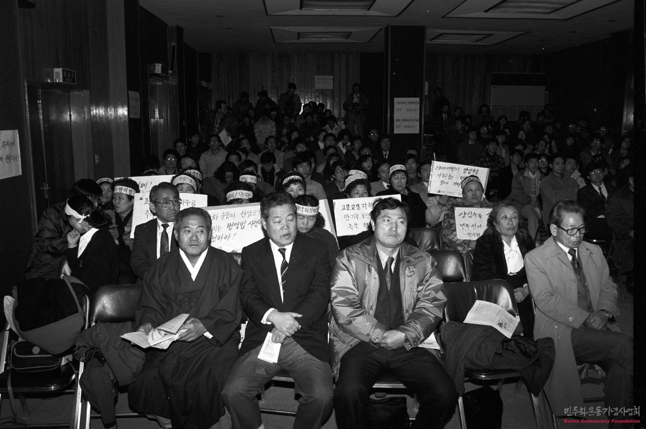 피켓을 들고 결의대회에 참가해 연설을 듣고 있는 민주인사들