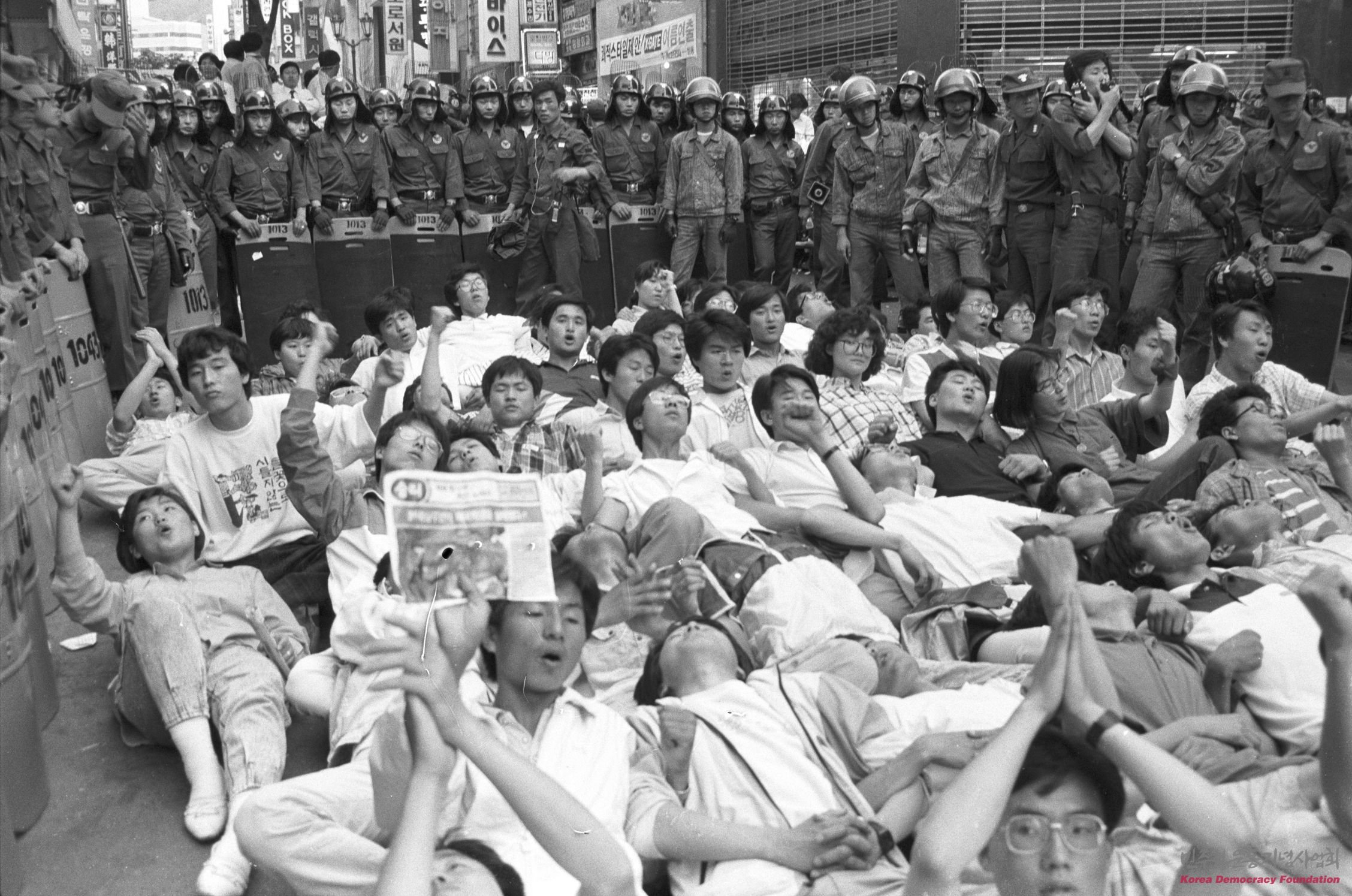 경찰의 연행을 저지하기 위해 스크럼을 짜고 누워 시위를 벌이는 단식 농성 참가자들 모습 2