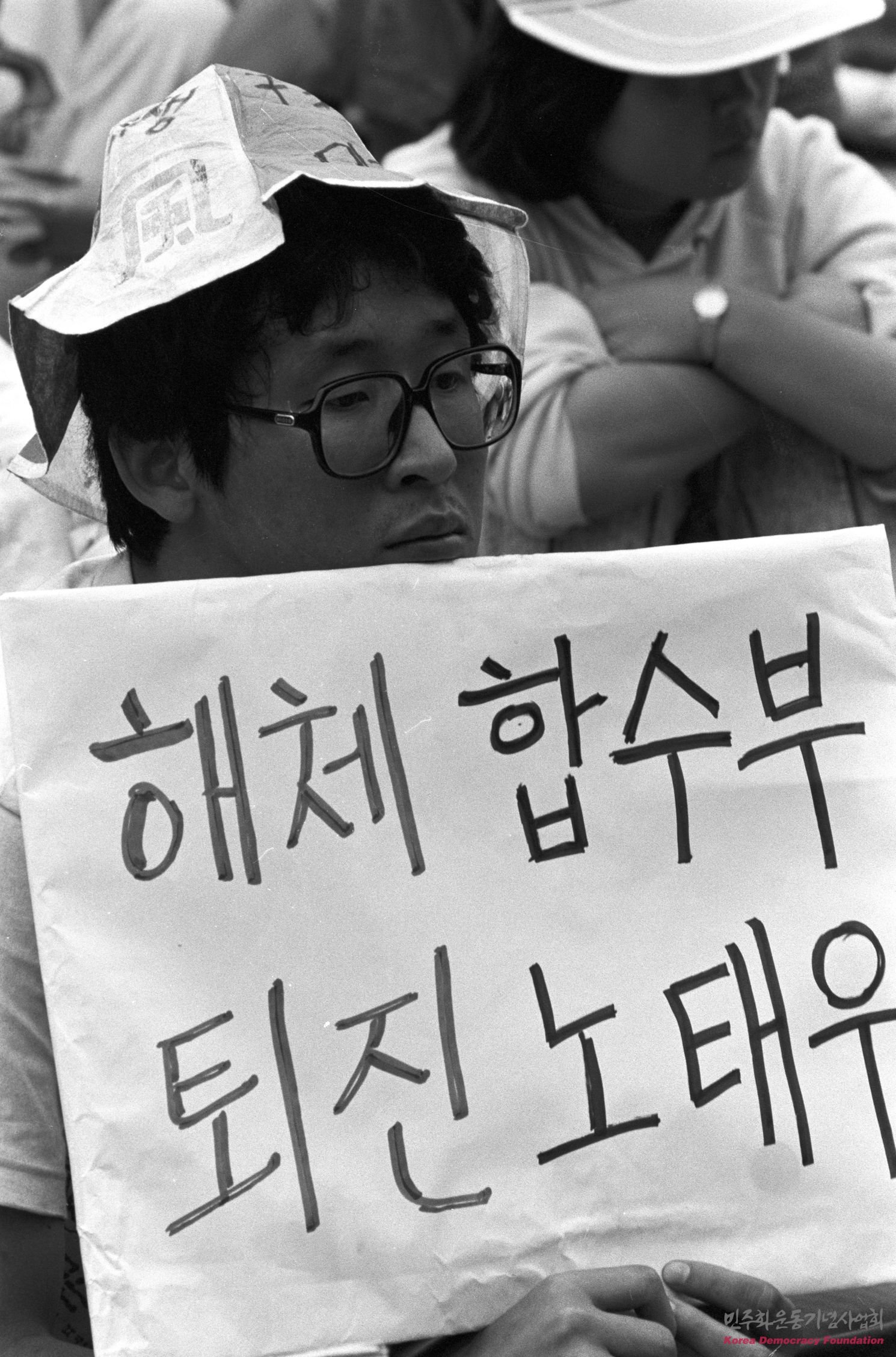 "해체 합수부 퇴진 노태우" 란 피켓을 든 농성참가자 모습