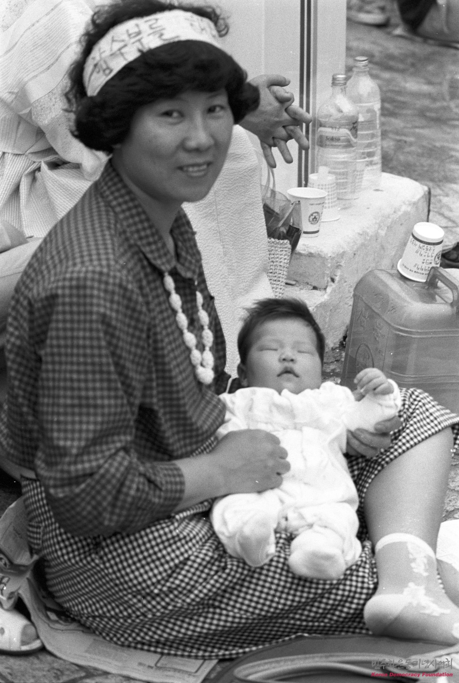 잠든 갓난 아기를 안고 구국 단식 농성에 참여한 여성참가자의 모습
