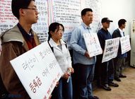 플래카드를 들고 가두행진을 하고 있는 각 단체 대표들