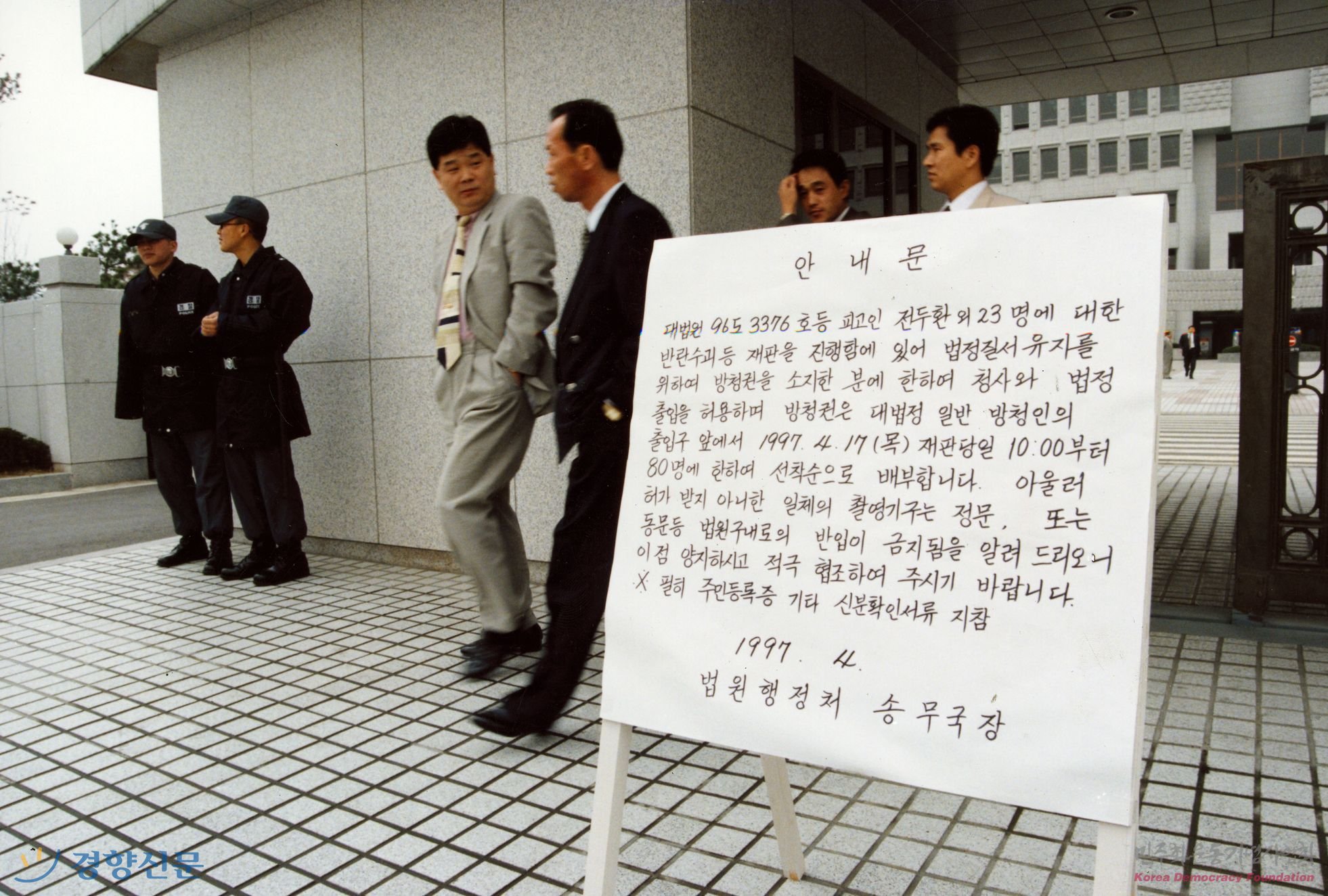 법원 정문 앞에 세워진 전두환 외 23명에 대한 반란수괴 등의 재판의 방청권 배부 안내문