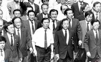 "계엄해제" 와 "유신잔당 자폭하라" 등을 요구하며 밤에 횃불을 켠 채 연좌시위 중인 학생들