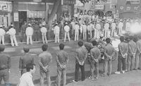 - 전국농민회총연맹 소속 농민들이 여의도 국회의사당 앞에서 "추곡수매날치기 통과 감시단 발대식"을 갖고 구호를 외치고 있다.