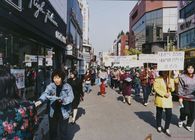거리에서 피켓들 들고 시민들에게 유인물을 나눠주며 씀씀이 줄이기 캠페인을 벌이고 있는 주부들