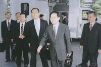 평양 순안공항에서 두 손을 맞잡은 김대중 대통령과 김정일 국방위원장