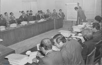 김윤구 현대건설 사장이 정주영 명예회장과 김정일 국방위원장이 만나는 사진이 실린 신문을 기자들에게 보여주는 모습