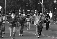 계엄령 발포로 건물 앞에 자리잡은 탱크와 군인