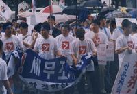 - 8일 오후 연세대에서 열린 국가안전기획부 취업설명회에서 안기부 직원이 설명하는 가운데 설명회에 참석한 학생들 앞에서 안기부반대, 국가보안법철폐 등을 적은 피켓을 들고 침묵시위하고 있다.