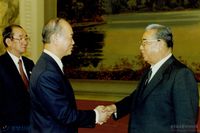 수재민 물자인도를 위한 남북적 실무접촉 회의장 주변에서 이야기 나누는 남북의 취재진들