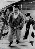 한보사건 4차 공판에 출두하기 위해 링거를 꽂고 휠체어를 탄 채 나서는 전 한보그룹 회장과 그의 셋째 아들 정보근의 모습