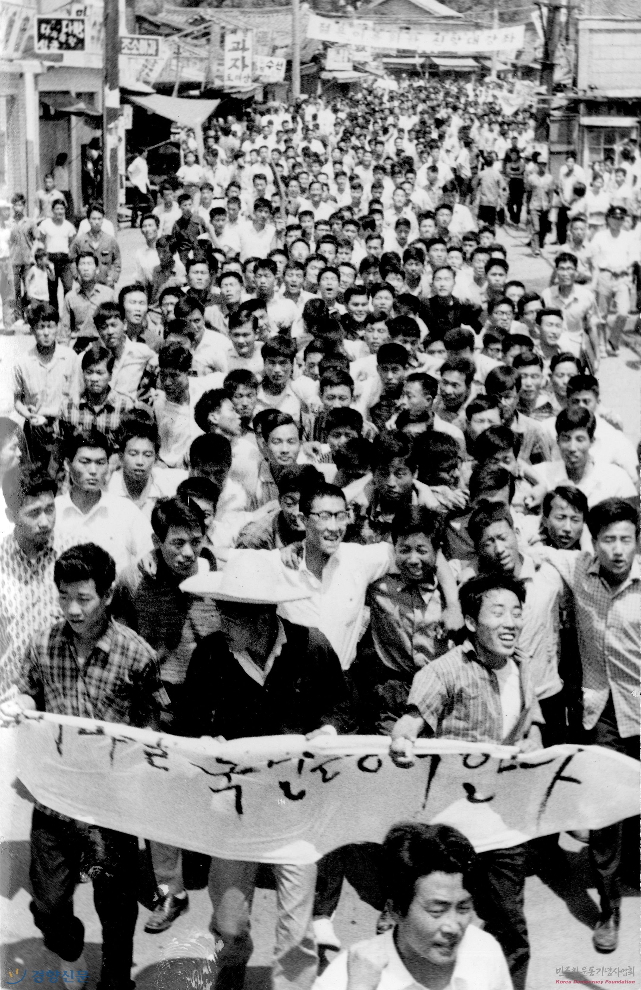 한일굴욕외교를 반대하며 서로 어깨를 걸고 가두행진하는 학생 시위대