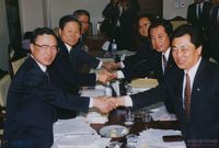 김영삼 대통령이 청와대에서 관계자들과 함께 교육개혁위원회로부터 제4차 교육개혁안을 보고 받고 있는 모습