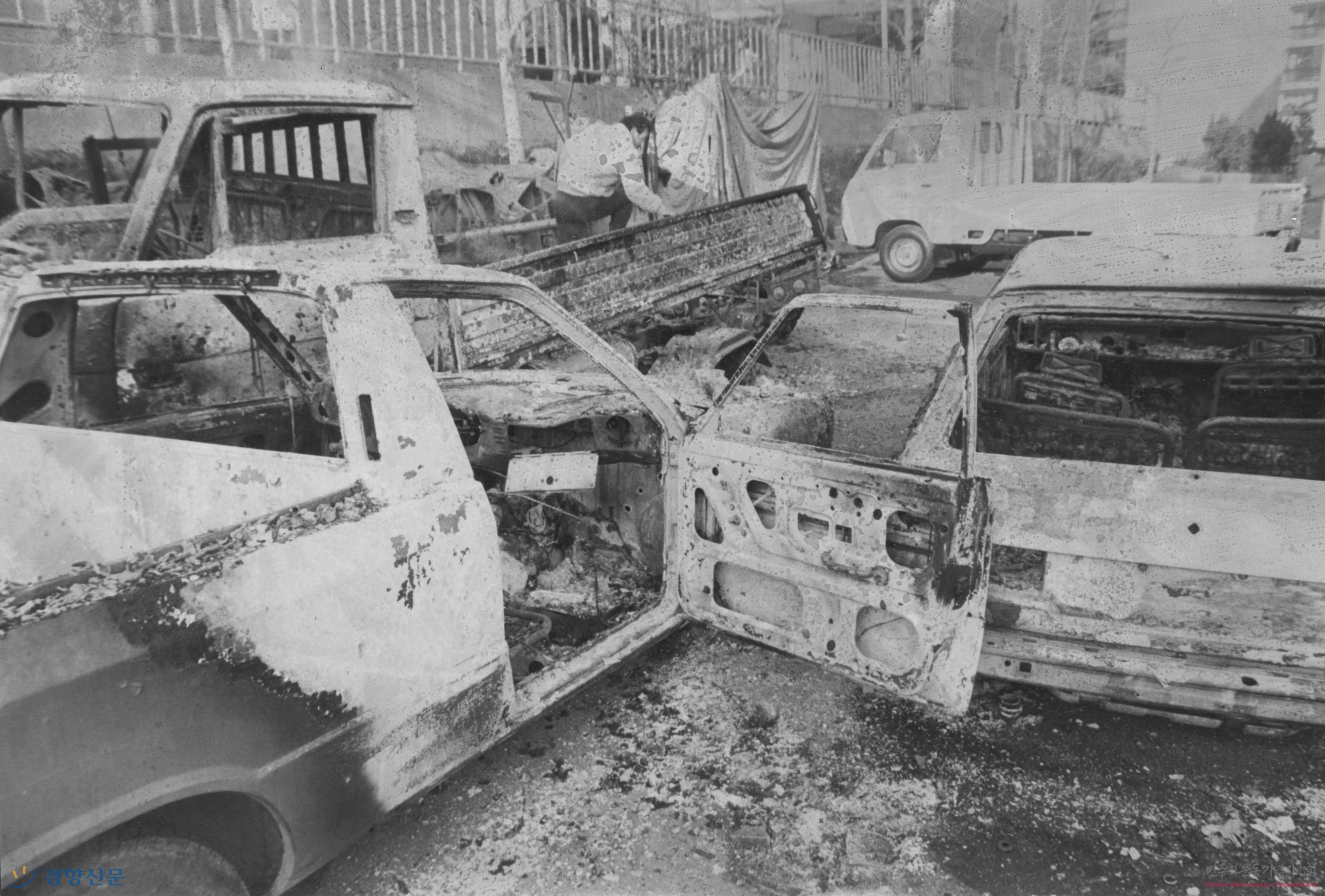 구로구 부재자 투표함 사전 이송시비를 벌이다 방화된 차량들의 모습