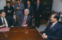 충남 공군20전투 비행단을 방문 조종사들과 함께 승리의 브이를 그리고 있는 김대중 대통령