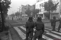 - 통일의 의지를 상징키 위해 연세대 교정에 세워진 초대형 장승이 누군가에 의해 잘려져 나가자 총학생회측이 이에 반발 대자보를 붙여 지나가는 학생들이 바라보고 있다.