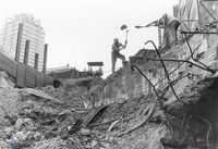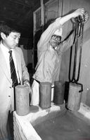 모피공장의 화재를 진압하기 위해 물을 나르는 종업원들