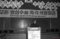 KAL기 피격사건과 관련하여 소련을 규탄하는 궐기대회에 수많은 사람들이 참여하고 있는 모습