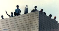 서해 훼리호 참사 유가족들이 교통부청사 앞에서 정부의 성의있는 배상을 촉구하며 가두 시위를 벌이고 있는 모습