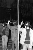 광주서구 갑구 민정당 후보가 연설하자 앉은 채로 등을 돌리는 평민당원들