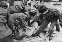 오열하는 사람들과 전태일의 운구를 운반하는 모습