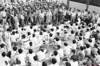 제2대 통일주체 국민회의 대의원 선거 투표가 끝난 후 개표작업에 한창인 모습