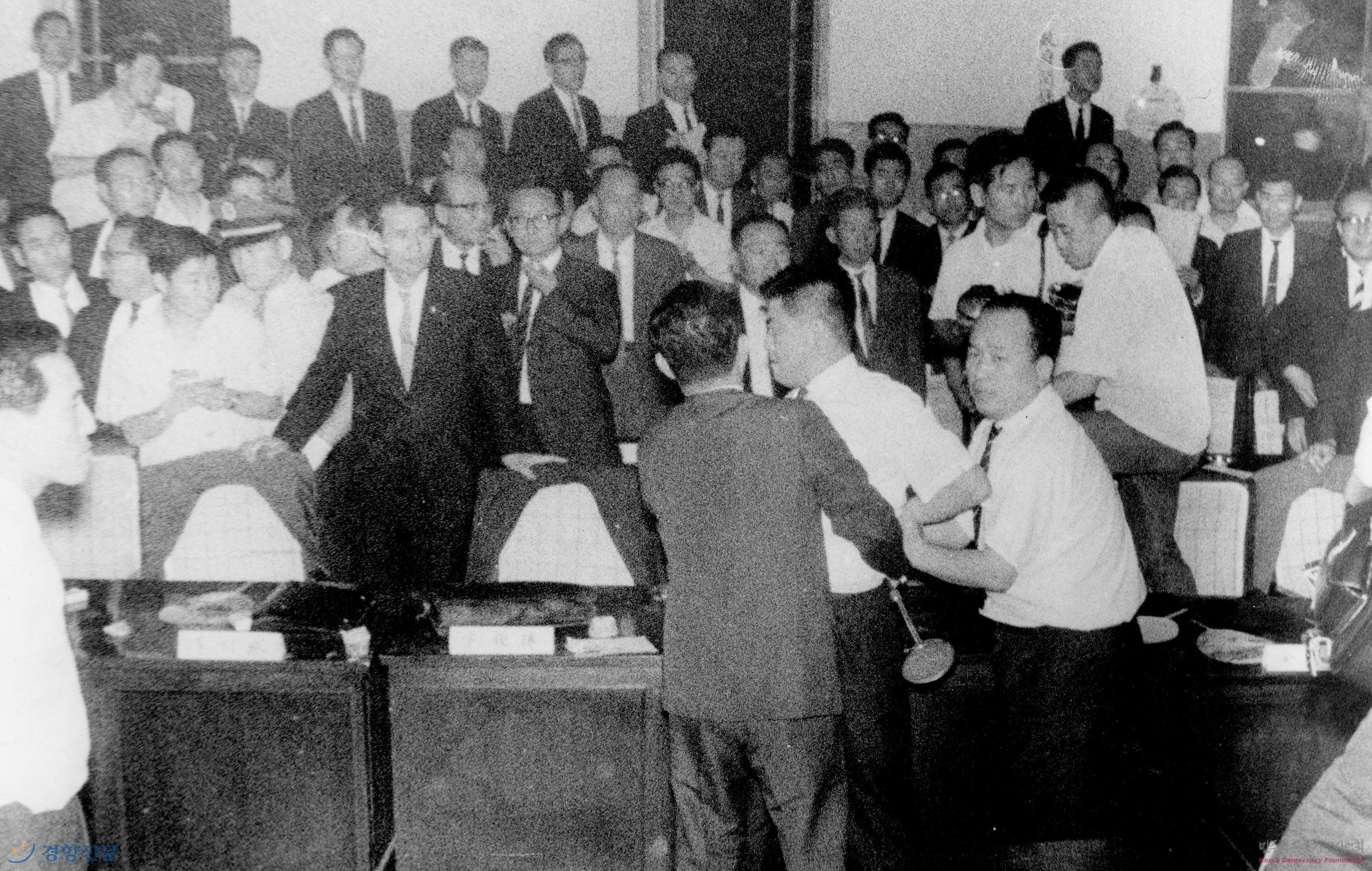 국회 사회석에서 마이크를 두고 옥신각신하는 의원들