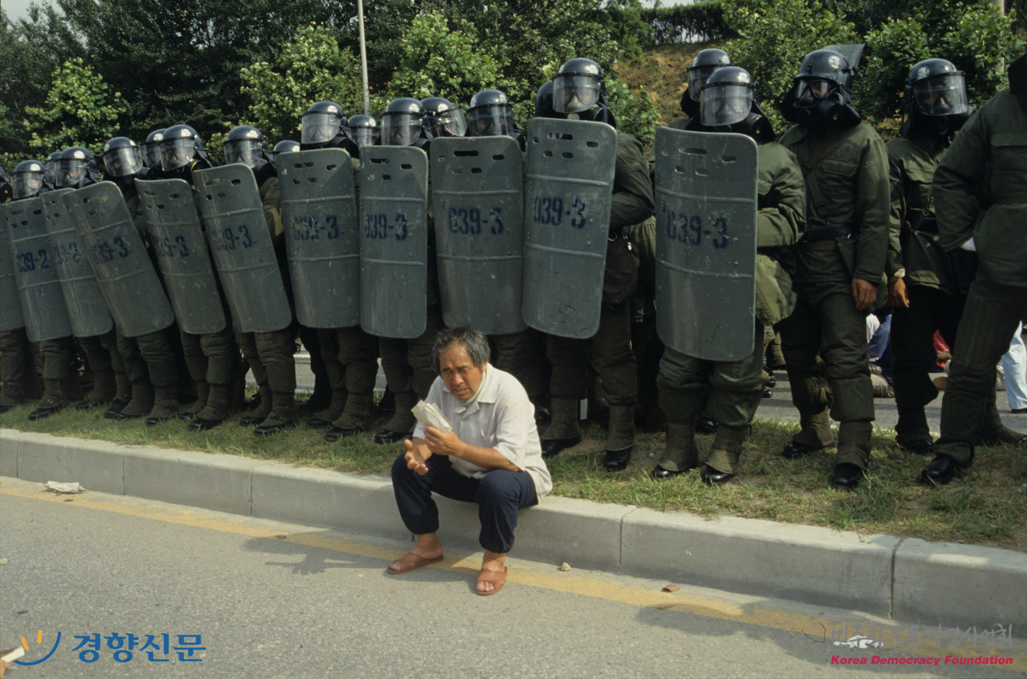 대치 중인 전경들 앞에서 울분을 토하는 중년 남성의 모습