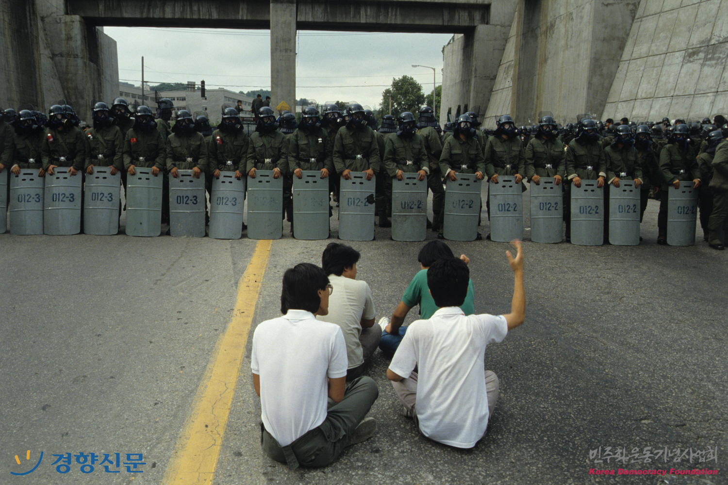 저지하는 전경들 앞에 연좌 시위을 벌이는 네 명의 학생