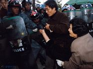 경찰의 저지로 인해 교내로 들어가지 못하고 비를 맞으며 민추협 박찬종의 말에 귀 기울이고 있는 민추협 소속 사람들