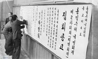 미문화원 점거 농성 중에 바깥의 기자들의 질문에 귀를 기울이는 학생들