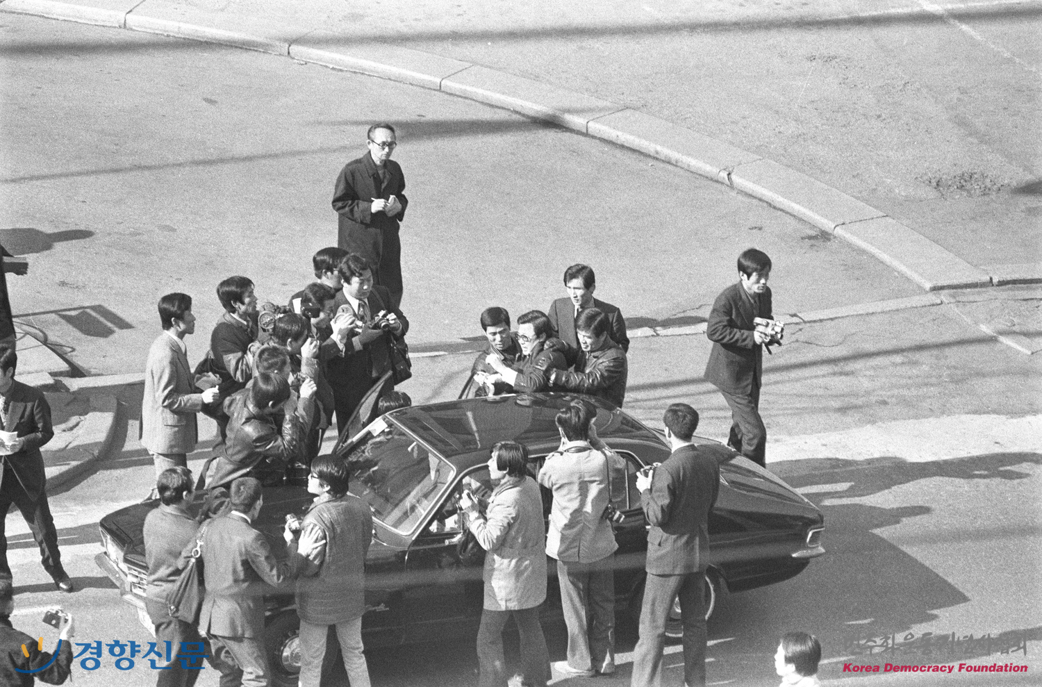 국회 앞에서 원외투쟁을 하던 신민당 의원이 경찰에 의해 강제 연행되는 모습을 촬영하는 기자들