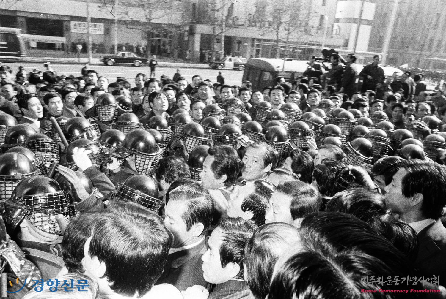 국회 앞에서 원외투쟁을 하는 신민당 의원과 격렬하게 몸싸움을 하는 무장경찰들