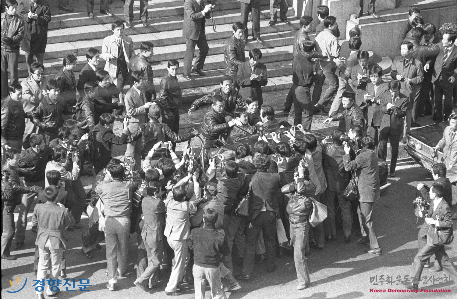 경찰에 의해 강제연행되는 원외투쟁하던 신민당 의원을 취재하는 기자들 모습