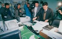 원외투쟁을 결의한 신민당 총재 김영삼을 취재하는 기자들