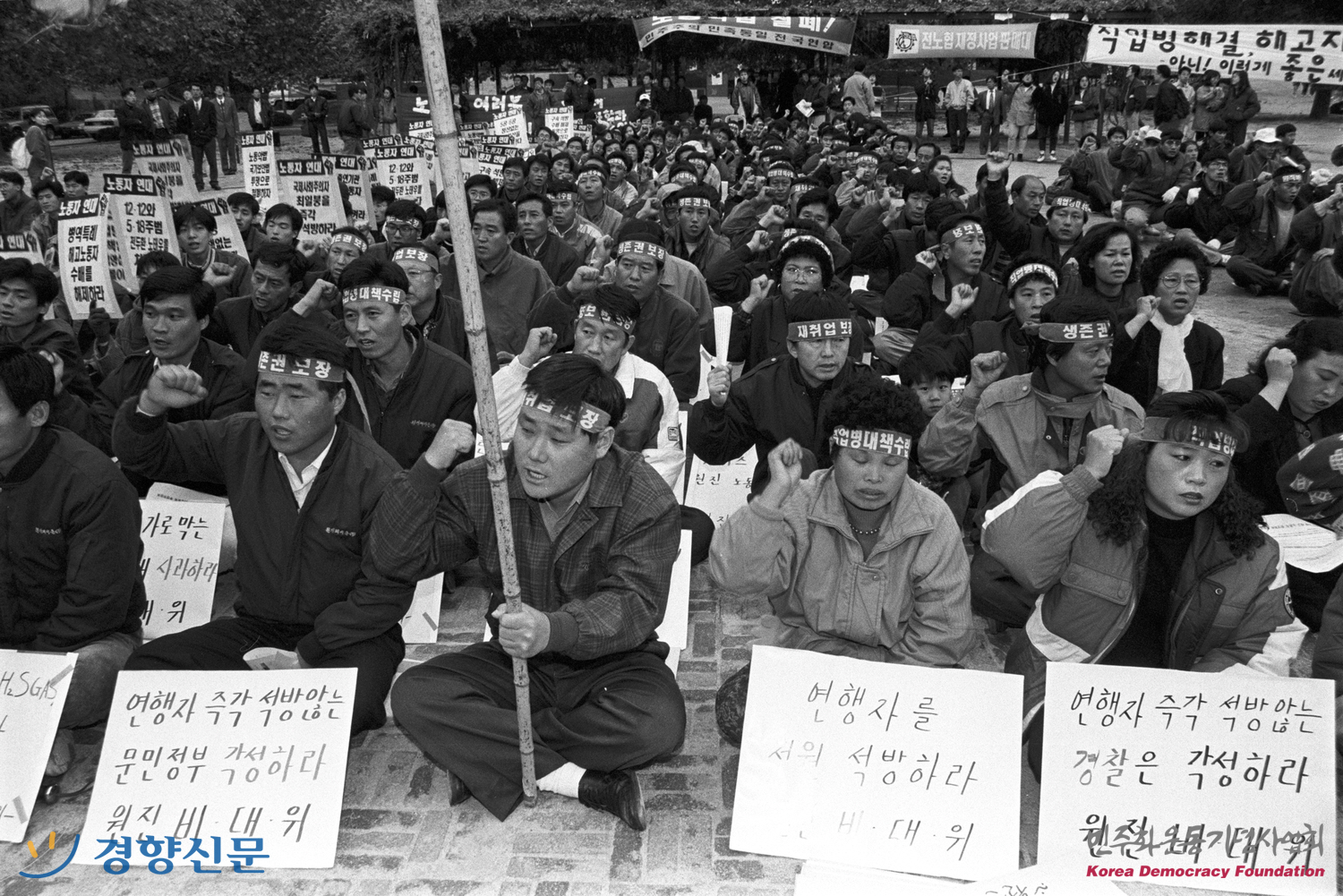 구호를 외치며 해고노동자 복직 및 노동법 철폐요구 연좌 시위를 하는 모습
