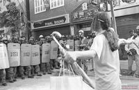 쌀 생산비 보장과 WTO비준반대를 위한 95 전국농민대회에서 구호를 외치며 연좌시위하는 농민들
