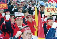 "노조탄압 분쇄하고 노동악법 철폐하자" 는 플래카드를 들고 가두 시위하는 전국노동조합 대표자회의 소속 회원들