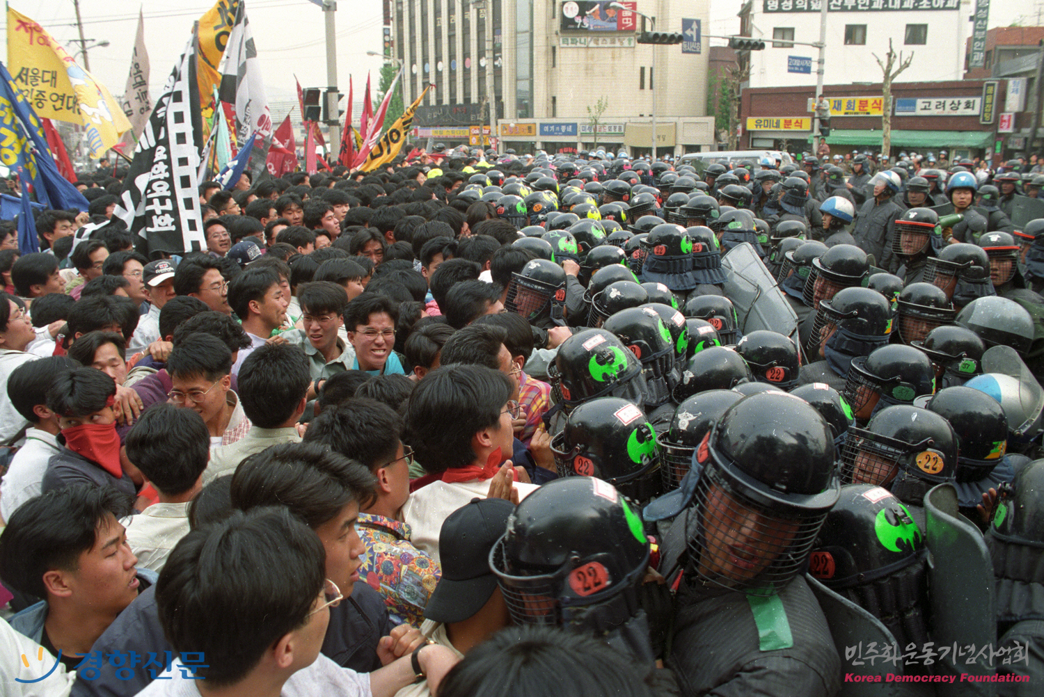고려대에서 열린 세계 노동절 청년 학생 결의대회 뒤, 가두 행진을 저지하는 경찰과 대치 중인 학생 및 청년들 모습