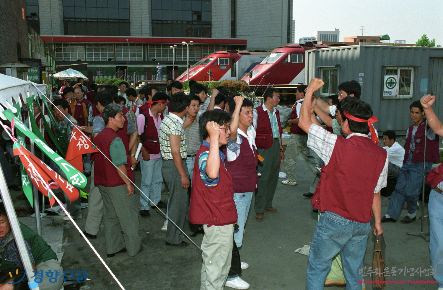 용산역 동차사무소 앞에서 구호를 외치며 농성 중인 전지협 소속 사람들