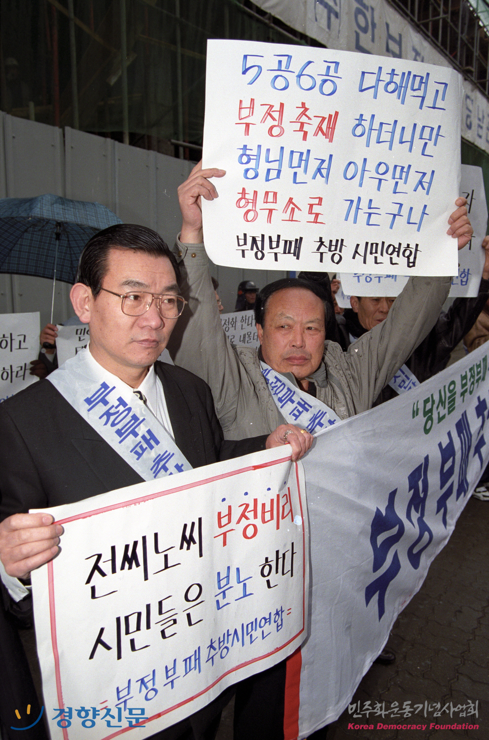 노태우 비리 사건과 관련해 피켓을 들고 시위하는 사람들의 모습
