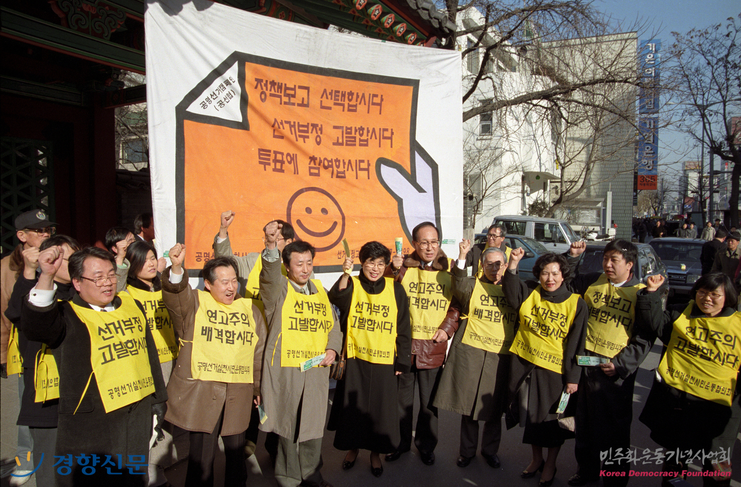 공선협 회원들이 노란 조끼를 입고 공명선거 캠페인을 벌이는 모습