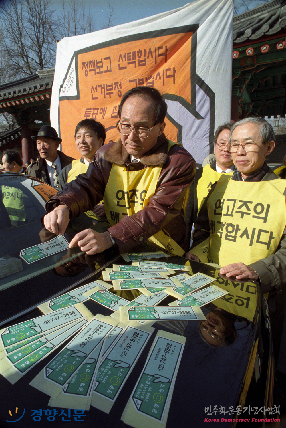 공선협 회원들이 자동차에 공명선거 스티커를 붙여주며 캠페인을 하는 모습