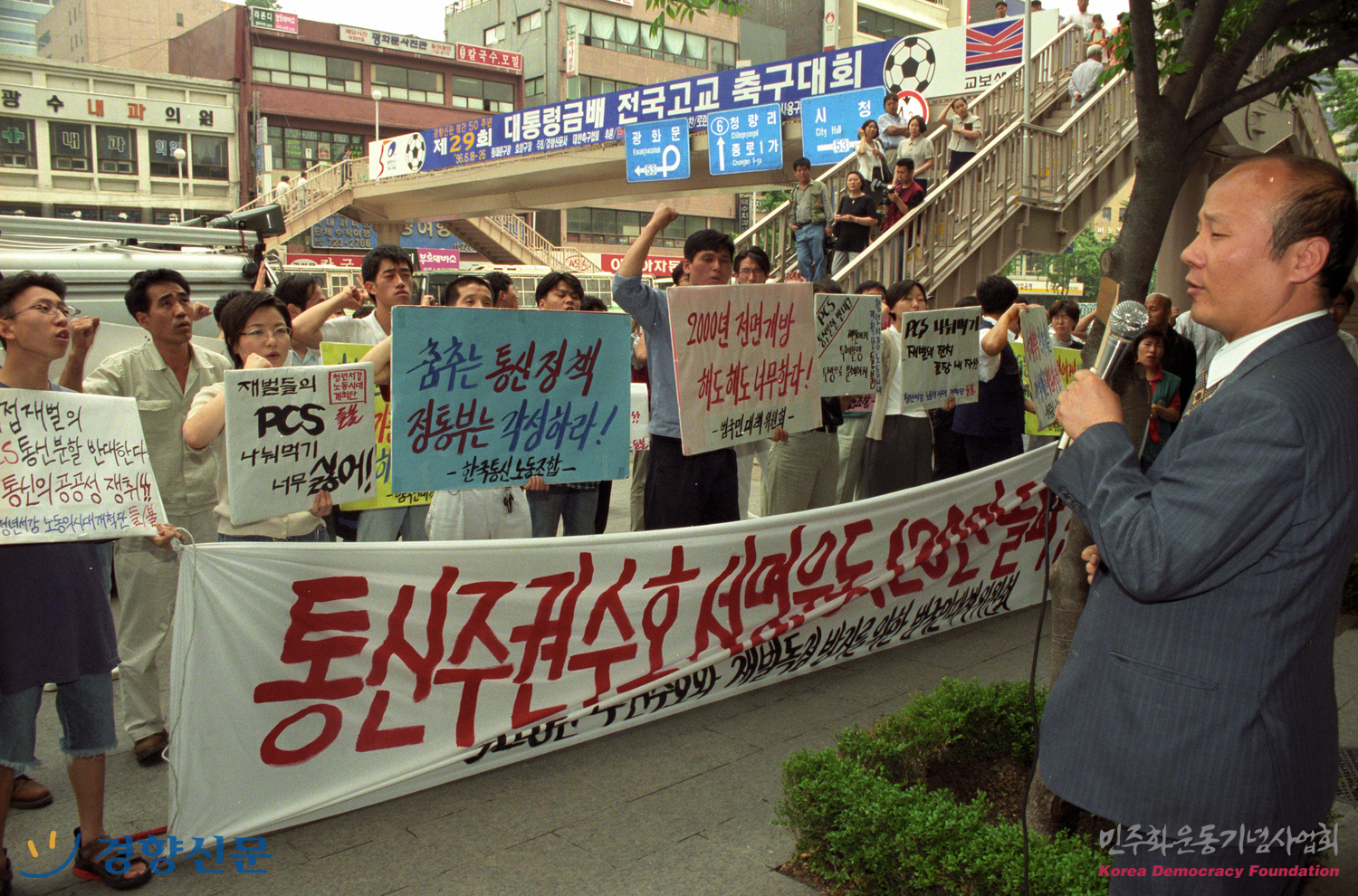 정부의 PCS 선정에 반대해 거리에서 플래카드와 피켓을 들고 시위를 벌이는 모습
