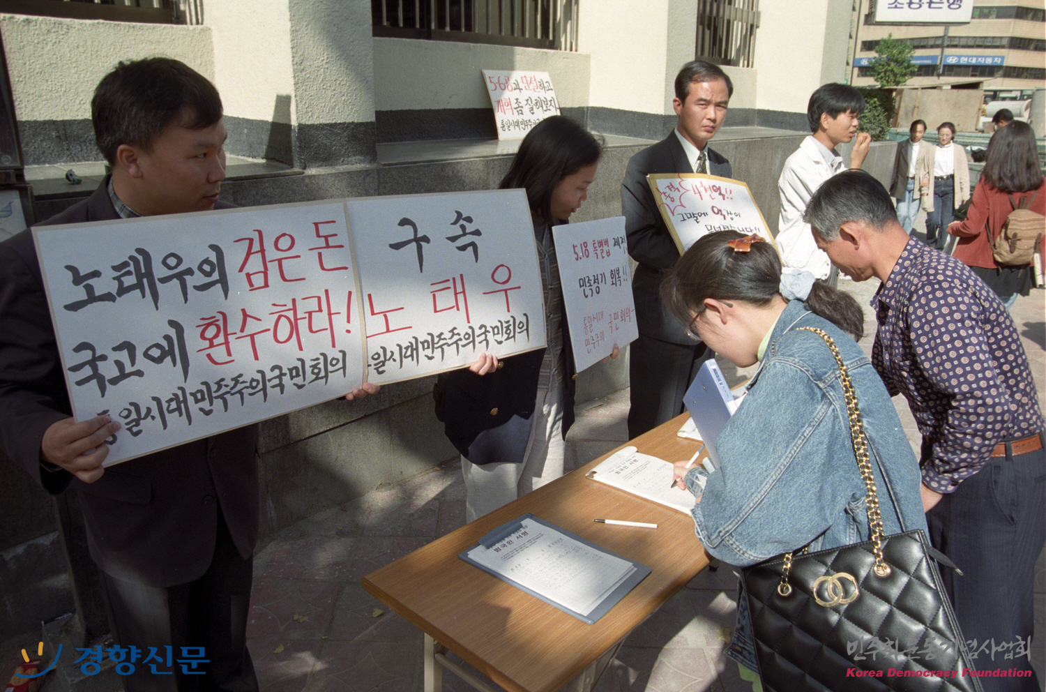 노태우 전 대통령 구속수사 및 비자금 환수 촉구를 요구하는 서명운동에서 시민들이 서명하는 모습