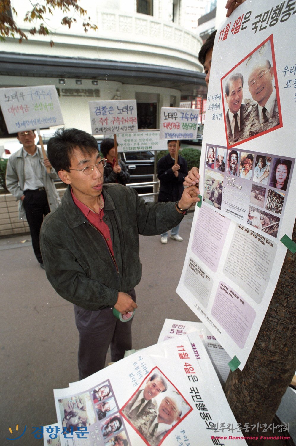 노태우 전 대통령의 구속 수사 및 비자금 환수 촉구 서명운동에서 관련 유인물을 가로수에 붙이는 모습